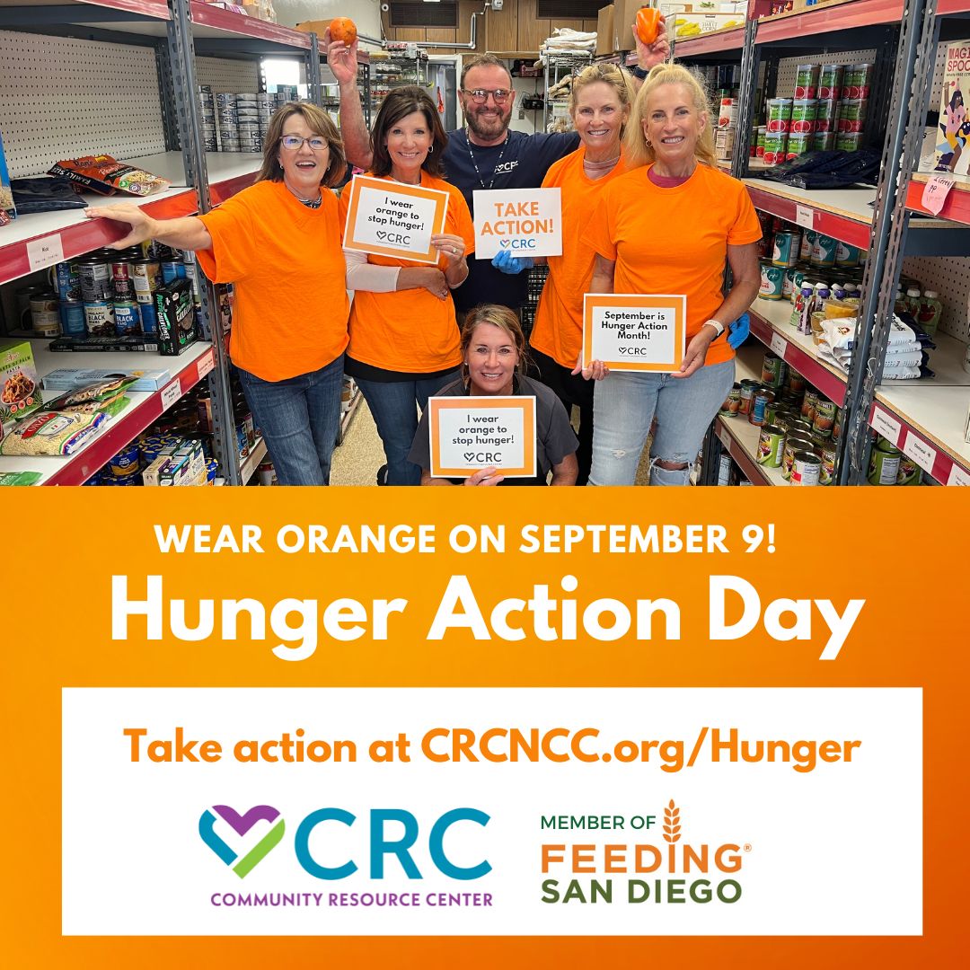 - September 9 (Tuesday): Participate in Hunger Action Day by sharing our social media posts to raise awareness about hunger in San Diego. Show your support by wearing orange and tagging us on social media @SanDiegoCRC or emailing your photos to Info@crcncc.org.